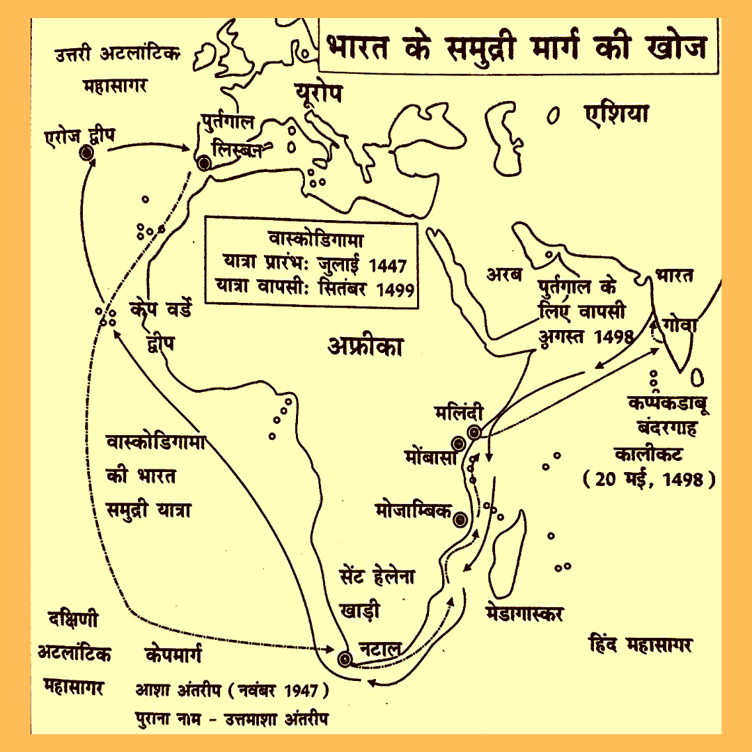 👉1494 ईस्वी में स्पेन के निवासी कोलंबस ने भारत पहुंचने का मार्ग ढूंढते हुए अमेरिका की खोज की| 1498 ईस्वी में वास्कोडिगामा ने उत्तमाशा अंतरीप ( केप ऑफ गुड होप ) के रास्ते भारत पहुंचने की सफलता प्राप्त की|
